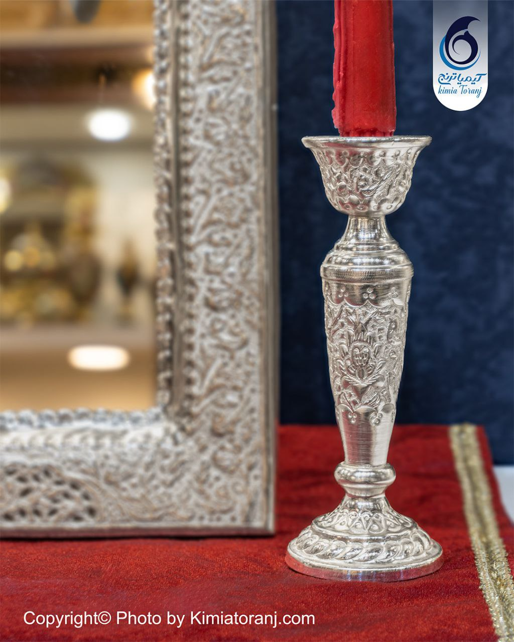 این سبک آینه و شمعدان ساخته شده از ورق خالص برنج است که با آبکاری نقره پوشش داده شده است. تمامی محصولات شبه نقره دارای روکش محافظ در برابر تغییر رنگ است. قلمزنی و ساخت قاب این محصول کاملا دست ساز بوده و در مجموعه صنایع دستی کیمیا ترنج انجام می شود.